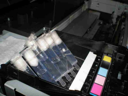 Отключаем принтер от сети! На штуцера печатающей головки происходит установка шприцов.