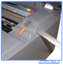 Установите клипсу с правой стороны аппарата и выведите через неё шлейф. Отрегулируйте шлейф таким образом, чтобы в крайних левом и правом положениях каретки шлейф излишне не натягивался и не провисал. Шлейф можно двигать, слегка разжимая клипсу-держатель шлейфа. Проверьте ход каретки, передвигая ее руками вправо-влево. Шлейф нигде не должен заминаться, пережиматься, цепляться, сильно натягиваться или тормозить каретку.