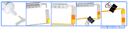 Переверните капсулу и состыкуйте её со шприцем через специальный переходник, вставленный в носик шприца. Медленно потяните на себя поршень шприца таким образом, чтобы чернила из ёмкостей начали заполнять капилляр. Дождитесь, пока заполниться весь капилляр и капсула наполовину, после чего пережмите капилляр зажимом или скрепкой в любом месте. Отсоедините капсулу от шприца и наденьте её на соответствующий чернильный штуцер печатающей головки принтера. После этого можно освободить зажим.