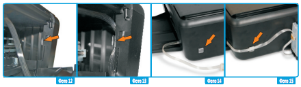 В правой части принтера, с внутренней стороны установите клипсу КУ (фото 12); затем проложите через неё капиллярный шлейф (фото 13). Согласно фото 14, установите клипсу КУ на корпус принтера. Проложите шлейф СНПЧ через клипсу (фото 15).