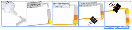 Снимите, затем переверните капсулу и состыкуйте её со шприцем через специальный переходник, вставленный в носик шприца. Медленно потяните на себя поршень шприца таким образом, чтобы чернила из ёмкостей начали заполнять капилляр. Дождитесь, пока заполниться весь капилляр и капсула наполовину, после чего пережмите капилляр биндером в любом месте. Отсоедините капсулу от шприца и наденьте её на соответствующий чернильный штуцер печатающей головки принтера. После этого можно освободить зажим. Заправьте таким образом все капсулы.